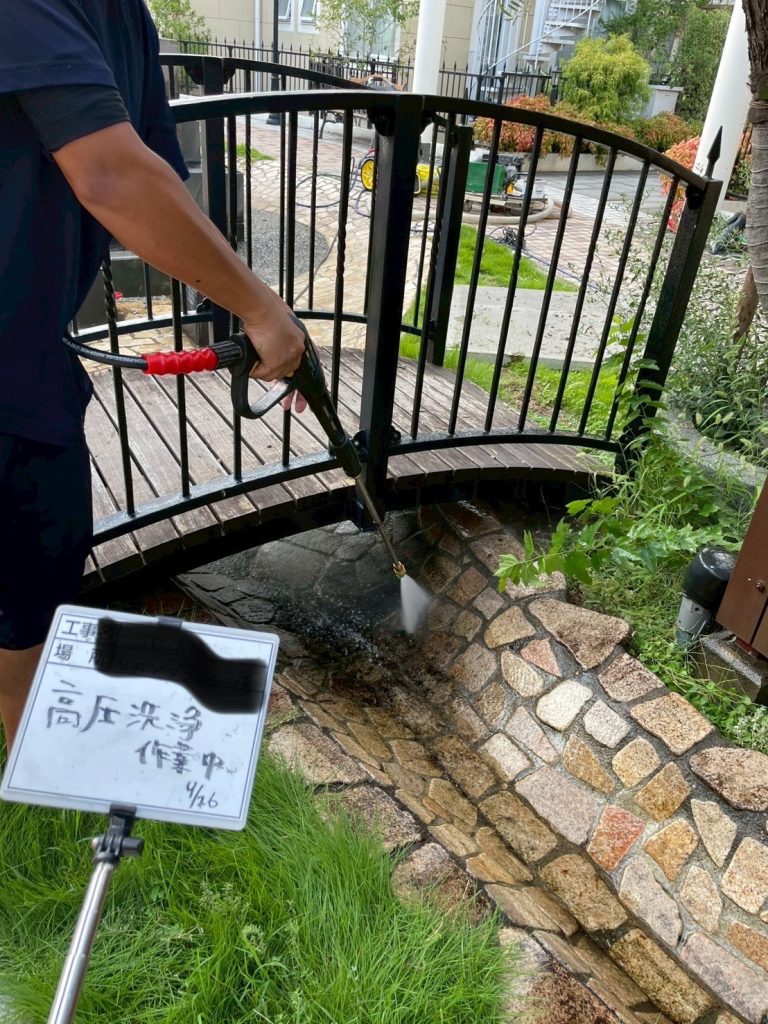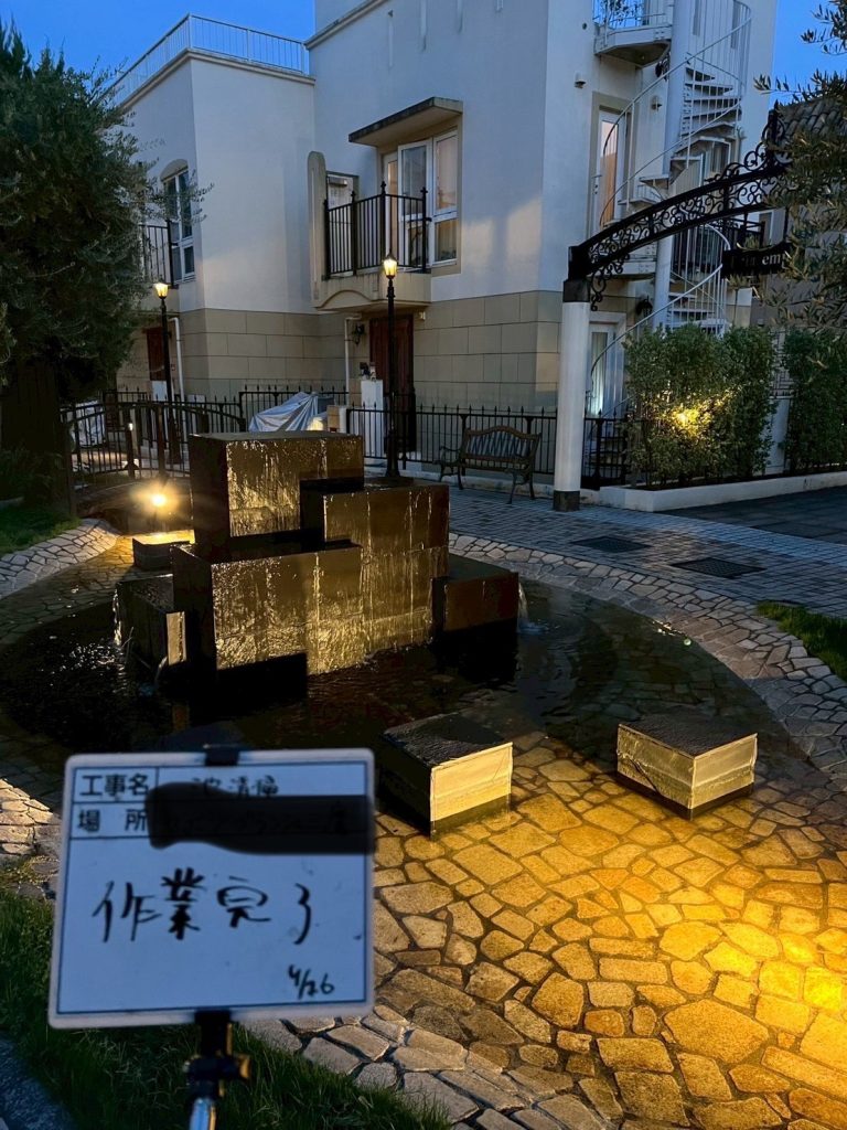 今回は、三鷹市にあるマンションの共用部分に設置された小川と池の清掃を行いました。水を常時張っているため、どうしてもコケや泥、落ち葉などの汚れが蓄積しやすく、定期的な清掃が必要となります。清潔で美しい水辺環境を維持することで、入居者の皆さまに快適な暮らしを提供できます。
