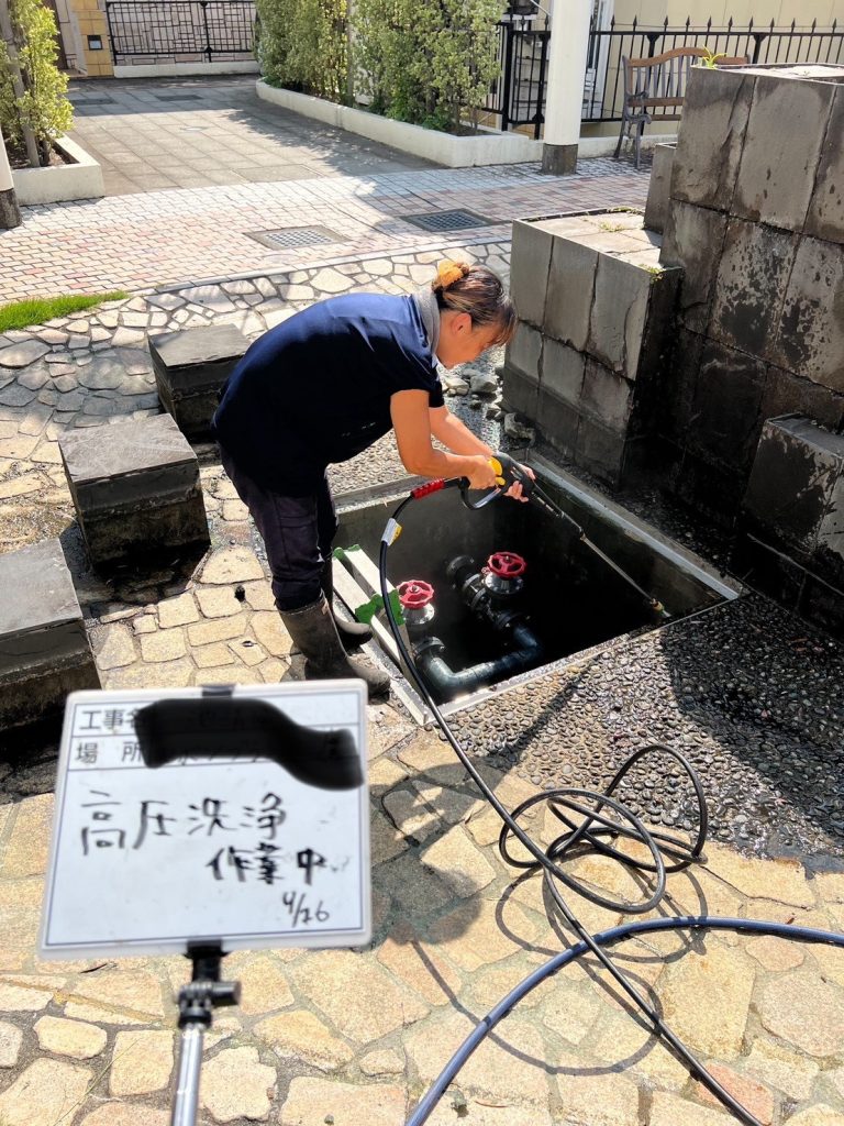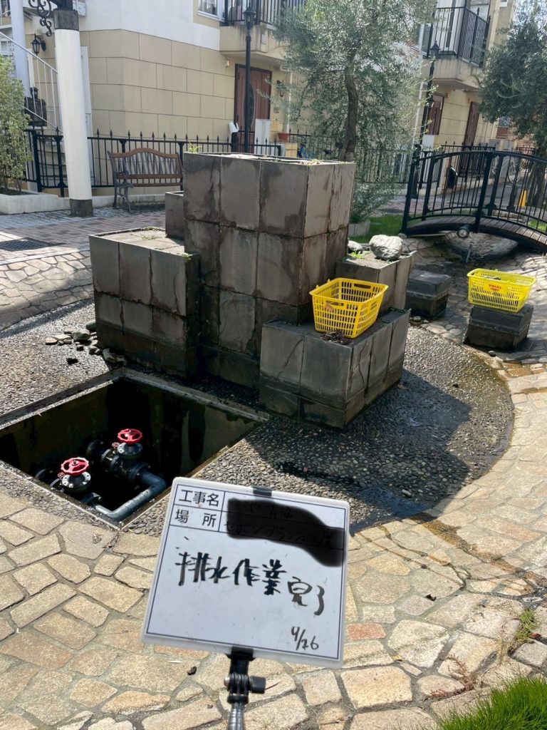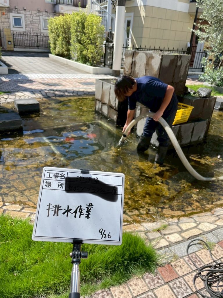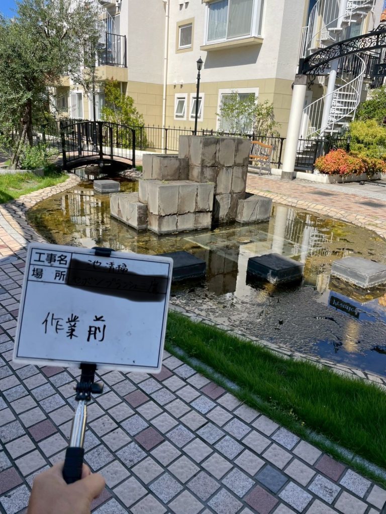 作業場所は、東京都三鷹市内にあるマンションです。緑豊かな環境に囲まれた立地のため、周辺から落ち葉や砂が入りやすく、放置すると水質の悪化や景観の低下につながります。そのため、年間を通して計画的に清掃を行うことが求められています。