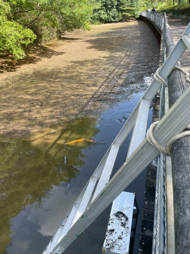 長年地域の自然環境に溶け込んでいた池ですが、水不足により水位が著しく低下し、鯉が生息し続けることが難しい状況となっていました。