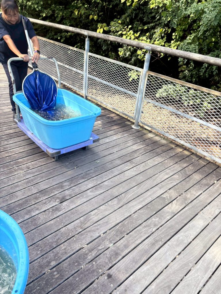 鯉の捕獲には専用の網や水槽を使用し、魚に負担がかからないよう慎重に扱いました。大型の鯉 58匹、小魚11匹を捕獲運搬し移送には台車を使用しスピーディーに運搬を行いました。